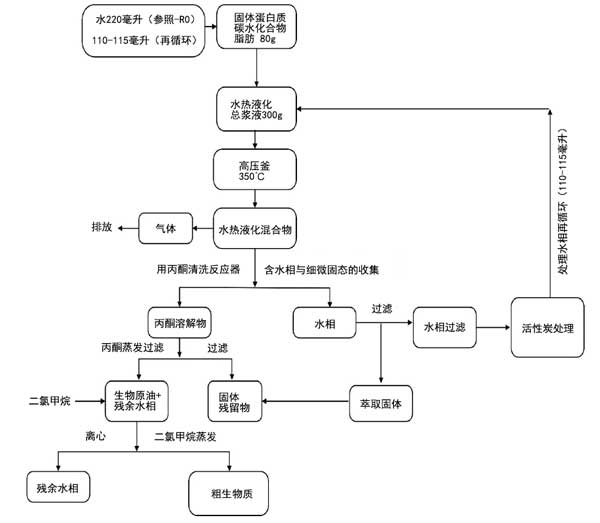 圖1:水熱液化加工與產(chǎn)品分離程序示意圖。