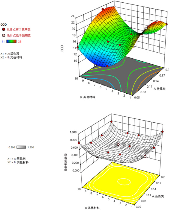 圖1:用于活性炭工藝的有效實(shí)驗(yàn)變化與COD去除的3D圖和標(biāo)準(zhǔn)誤差。