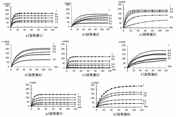 實驗發(fā)現(xiàn)即使在成分指標(biāo)、技術(shù)特征和處理來自不同地理形成地點的相同類型廢物形式的原材料的條件下,活性炭吸附劑的產(chǎn)率和個體特性也很接近。根據(jù)現(xiàn)有的信息來源,它們并不總是與其最佳樣本相對應(yīng)。下述實驗數(shù)據(jù)證實了這種情況。然而,它們具有不同的,并且在某些情況下具有高效率,可用于解決從工業(yè)排放物和排放物的有機雜質(zhì)中凈化的廣泛問題。在植物廢物(a)中獲得的活性炭從其VMA中吸附正丁醇蒸氣的動力學(xué)曲線在圖1和圖2中進行了比較。