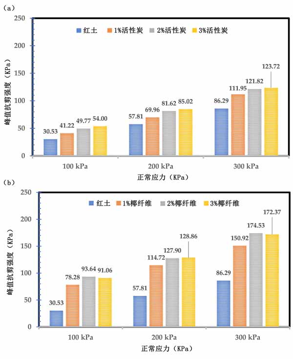活性炭試樣的剪切強(qiáng)度與剪切應(yīng)變的關(guān)系。峰值剪切強(qiáng)度隨著正應(yīng)力的增加而提高,特別是300kPa正應(yīng)力。此外,添加活性炭增加了峰值剪切強(qiáng)度,并且增強(qiáng)率隨著法向應(yīng)力的增加而增加,如圖4a所示。同樣,添加0.5%的椰殼纖維進(jìn)一步提高了活性炭穩(wěn)定土的峰值剪切強(qiáng)度,如圖4b所示。雖然在天然紅土中添加活性炭會(huì)增加峰值強(qiáng)度,但對(duì)于超過(guò)2%的活性炭,增加率并不顯著。例如,活性炭穩(wěn)定土的峰值強(qiáng)度分別為2%和3%活性炭的121.8kPa和123.72kPa。總體而言,與本研究的結(jié)果相似。發(fā)現(xiàn)在石灰穩(wěn)定土壤中使用椰殼纖維可進(jìn)一步提高抗拉強(qiáng)度和抗壓強(qiáng)度。還觀察到,椰殼纖維的加入提高了膨脹土中的兩個(gè)剪切參數(shù)。