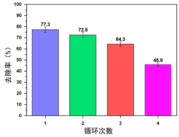 通過回收研究調(diào)查了改性活性炭的再利用以從廢水中去除活性黑5。進(jìn)行實(shí)驗(yàn)時,最初使用100mg/L活性黑5和0.8g/L的改性活性炭,pH值為2。在第一個循環(huán)之后,使用0.01M/NaOH溶液對所使用的改性活性炭顆粒進(jìn)行處理大約2小時。此后,用蒸餾水沖洗顆粒以除去任何殘留的堿。選擇被認(rèn)為可接受的重復(fù)時間,以便能夠在后續(xù)循環(huán)中重復(fù)使用吸附劑。研究結(jié)果如圖3所示。在用1M/NaOH處理成功再生后,解吸的改性活性炭能夠重復(fù)使用多達(dá)四個循環(huán)以去除活性黑5;钚院5的去除百分比在第一個循環(huán)中約為77.3%,在第四個循環(huán)后下降至約45.9%。總的來說,這項(xiàng)研究證明了將改性活性炭吸附劑重復(fù)使用四個循環(huán)以從廢水中去除活性黑5的潛力。