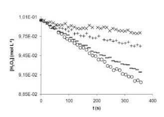 為了獲得關(guān)于活性炭的化學(xué)性質(zhì)的更多信息,就其酸性-堿性和氧化還原性質(zhì)而言,研究了溶液的pH和過氧化氫中活性炭表面的化學(xué)修飾的影響。 。對于該反應(yīng)混合物與過氧化物濃度0.100mol L的固定組合物-1和CAT等于2,00x10 -3克·毫升-1 在298K的溫度下發(fā)現(xiàn):在2-10個pH單位的溶液范圍內(nèi),初始反應(yīng)速率沒有顯著變化。該結(jié)果與Bohem滴定法給出的活性炭中官能團(tuán)的組成一致,其中活性酸基團(tuán)與堿性基團(tuán)相比是非常低的比例。強(qiáng)氧化劑,如高錳酸鉀和過氧化氫,會大大改變影響過氧化氫的表面(圖1),從而可以推斷活性炭表面存在還原基團(tuán)作為過氧化氫的活性位點(diǎn)。活性炭表面的化學(xué)處理按以下方式進(jìn)行:用HNO3濃度5mol L-1 6個小時,用KMnO 4濃度0.08mol L-1在酸H 2 SO 4 濃度為0.5mol L-1 4小時用H 2 ö 2 的30%72小時。在每次處理結(jié)束時,將活性炭置于索氏提取器中一周,直到保證恒定的pH值。最后將活性炭在110℃下干燥至不再減輕重量,然后儲存在干燥器中。
