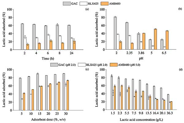 目前的研究表明,活性炭是一種好的吸附劑。然而,吸附在吸附劑上的乳酸的量不能作為選擇合適吸附劑的唯一參數(shù)。另外,活性炭的吸附能力經(jīng)過不同的吸附和解吸循環(huán)后可以降低,因此活性炭的長期性能對選擇最經(jīng)濟可行的材料至關重要。從吸附劑中解吸乳酸是一個重要的因素,需要作為下游加工策略來考察,但超出了本研究的范圍。