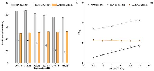 活性炭成功地應用于從模型發(fā)酵液中分離乳酸,pH值高于和低于pK a(3.86)乳酸值。溫度實驗表明,溫度從30°C升高到80°C,活性炭的乳酸回收率有所下降。從熱力學分析,乳酸吸附到吸附劑表明活性炭可以很好的吸附解吸乳酸。