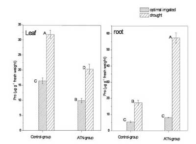 當(dāng)葉片中的游離脯氨酸含量降低時,表明當(dāng)存在活性炭混合物時,干旱條件下植物的生理損傷水平降低。這種影響可能是由于天然硅鋁酸鹽存在的濕度增加。盡管干旱條件誘導(dǎo)了對照組和活性炭混合物組的根中游離脯氨酸含量的顯著增加,但活性炭組中這種增加更為顯著;钚蕴炕旌衔锝M植物根中游離脯氨酸含量極高,增加了脯氨酸的保護作用,脯氨酸在植物組織中起到滲透物質(zhì)的作用:使植物更有效地吸收干旱土壤中的水分。