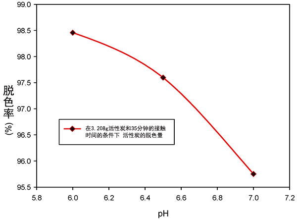 實驗過程中發(fā)現(xiàn),活性炭在較低的pH環(huán)境對顏色吸附效果得到大幅度增強。盡管如此,排放處理的酸性廢水的影響可能直接阻礙水生棲息地。鑒于此,使用預處理的活性炭吸附研究在6至7的可接受的pH范圍內(nèi)進行。考慮的另外兩個因素是劑量和接觸時間,并且它們分別保持在3.208g和35min。從圖3中可以看出可以觀察到,顏色去除的百分比隨著pH的降低而增加。在pH6時獲得最高的顏色去除率98.46%,但隨著pH增加到7,顏色去除率降低到95.69%。