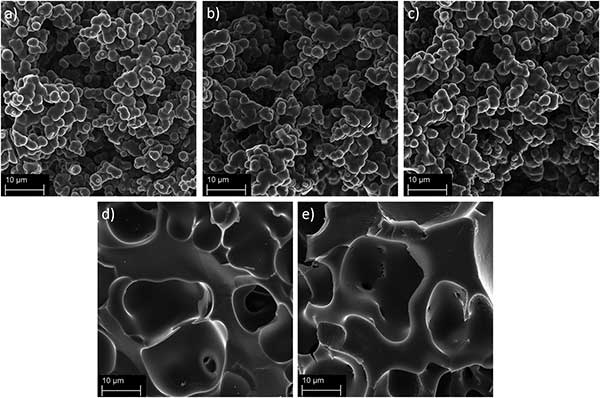 通過掃描電子顯微鏡對高比表面積活性炭進行表征于圖2a-c中?梢钥闯龅氖沁@幾種活性炭具有它是由球形碳顆粒的尺寸與周圍3μm的孔隙網(wǎng)絡結(jié)構(gòu),這是典型的基于甲醛樹脂活性炭。球形活性炭納米顆粒的燒結(jié)導致孔隙網(wǎng)絡內(nèi)的空腔,其在直徑為2至20μm的形成。活性炭表面是光滑的,沒有燒結(jié)的球形活性炭納米顆粒,而它們?nèi)匀辉诰W(wǎng)絡內(nèi)具有相似直徑的空腔。由于在化學活化之前低的預碳化溫度,球形納米顆粒在活化過程中強烈聚集,這導致如前所述的較不剛性的孔隙網(wǎng)絡。