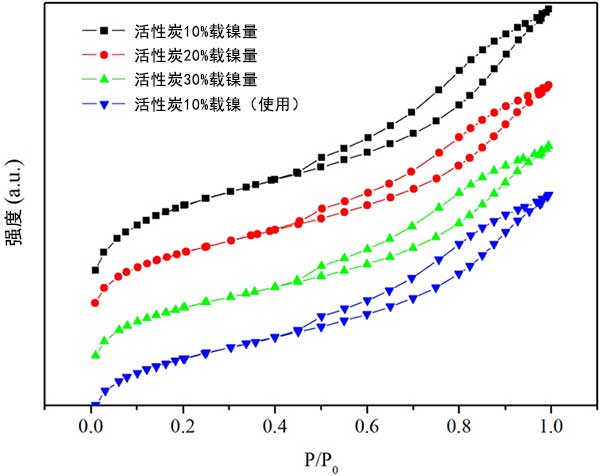為了研究活性炭載鎳催化劑的可重復使用性,首先在真空下過濾分離先前實驗的廢活性炭,然后用丙酮徹底洗滌,接著用水洗滌多次。然后將過濾的活性炭在強制通風烘箱中在110℃下干燥,然后在管式爐中在氮氣流下在500℃下煅燒4小時。經(jīng)過從新活化的活性炭的測試,活性炭對硬脂酸的產(chǎn)率和選擇性轉(zhuǎn)化為十七烷在重復三次催化后性能幾乎沒有下降。選擇性保持在約90%,在無溶劑體系中保持穩(wěn)定;钚蕴康腘2吸附-脫附等溫線如圖3所示,表明隨著鎳負載量的增加,活性炭的表面積和孔體積減小,表明過量的鎳顆?赡茏枞欢康幕钚蕴靠撞p少孔體積。