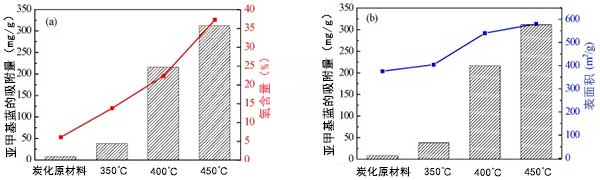 活性炭的空氣活化產(chǎn)生更多的分層孔結(jié)構(gòu),具有更高的表面積和更豐富的表面官能團(tuán)。更多數(shù)量的孔納米結(jié)構(gòu)可為染料分子提供大量吸附位點(diǎn)并改善其吸附能力。富含表面的官能團(tuán)可促進(jìn)活性炭在水中的分散,使活性炭在吸附過(guò)程中與染料完全接觸。這些性質(zhì)在空氣活化后賦予活性炭較好的亞甲基藍(lán)吸附性。在300℃至450℃的溫度下空氣活化后,盡管由于350℃活化導(dǎo)致的表面積略微增,但吸附容量是炭化原料的4.8倍。這種情況表明,表面積在提高空氣活化后活性炭的吸附能力方面起著次要作用。表面性質(zhì)的變化可能主要影響空氣活化后活性炭的吸附性能。結(jié)果得到了亞甲基藍(lán)吸附容量與受空氣活化溫度影響的活性炭表面積和氧含量的相關(guān)性的支持(圖7)。亞甲基藍(lán)的改善的吸附性能與與活化溫度相關(guān)的氧含量的變化趨勢(shì)很好地對(duì)應(yīng)(圖7a)。而隨著活化溫度的升高,吸附容量的增長(zhǎng)率遠(yuǎn)高于表面積(圖4b)。