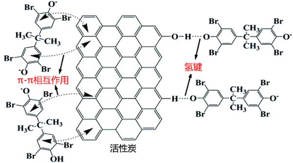 根據(jù)先前研究的多種吸附動力,包括靜電相互作用,氫鍵,π-π相互作用,疏水效應(yīng)等;谶@些結(jié)果,進(jìn)一步提出了四溴雙酚A在活性炭表面上的可能吸附過程(圖4)。由此可以推斷,由于苯環(huán)和活性炭表面上的-OH基團(tuán),π-π相互作用可能在吸附過程中起重要作用,因為給電子官能團(tuán)可能增強四溴雙酚A芳環(huán)的π-給體強度。氫鍵也對吸附產(chǎn)生顯著影響,活性炭可作為氫鍵供體,依賴于-OH基團(tuán)和表面上的芳環(huán),產(chǎn)生更好的吸附能力。此外,根據(jù)動力學(xué)模型分析的結(jié)果,吸附劑和吸附物之間可能存在電子交換或共價鍵。