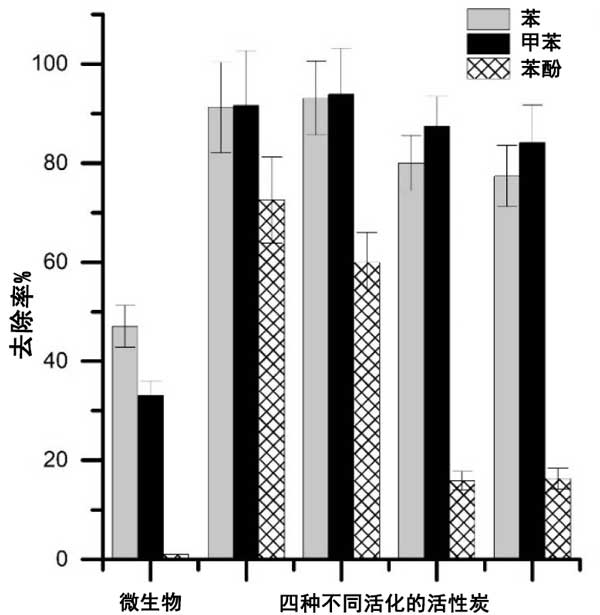 圖2:芳香族烴脫除通過用氫氧化鉀與三聚氰胺官能化的化學(xué)活化制備的活性炭,負載微生物的活性炭材料。