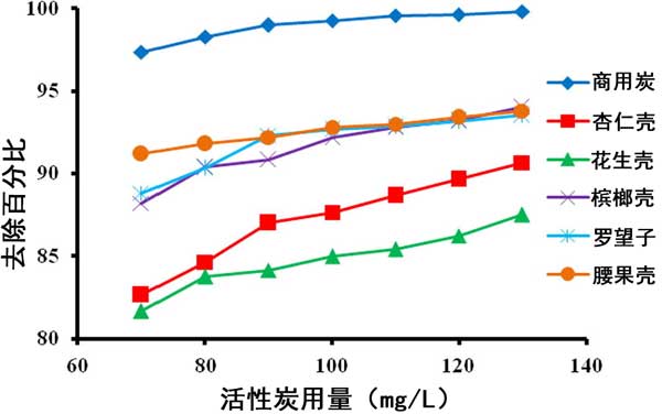 研究了用量對(duì)幾種農(nóng)業(yè)材料制成的活性炭和商用活性炭上天青A去除程度的影響;钚蕴亢蜕逃没钚蕴咳コ烨郃的百分比隨吸附劑劑量的增加而增加(圖2)。這可能是由于表面活性部位的可用性增加所致。