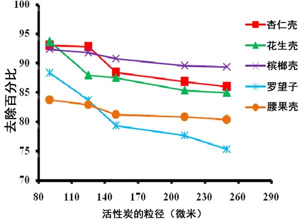 圖3:天青A粒徑變化對(duì)各種活性炭的影響。