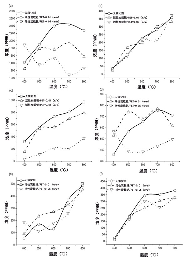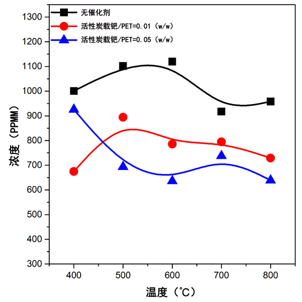 圖2:在有和沒有活性炭載鈀催化劑的條件下,聚對(duì)苯二甲酸乙二酯熱解過程中總胺衍生物的濃度隨溫度的變化。