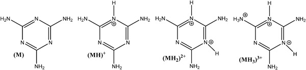 優(yōu)化了活性炭的用量和三聚氰胺溶液濃度范圍的影響,以實(shí)現(xiàn)定量分析吸附前后,以及這些研究中使用的所有活性炭中三聚氰胺的最佳條件。最初的實(shí)驗(yàn)涉及不同的吸附劑劑量,以及用于吸附物檢測(cè)和定量的多種方法。通過(guò)考慮三聚氰胺在水中的溶解度(酸性和堿性條件)以及吸附實(shí)驗(yàn)前后溶液中的可測(cè)量水平來(lái)選擇三聚氰胺溶液的濃度范圍。由于三聚氰胺(M)是堿,因此它可以在水溶液中經(jīng)歷幾次酸/堿平衡反應(yīng)并形成不同的質(zhì)子化物質(zhì)(見(jiàn)圖1)。