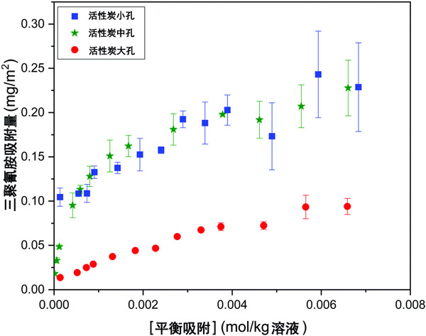 圖2:三聚氰胺在30°C下在三種活性炭的吸附等溫線,通過(guò)活性炭表面積標(biāo)準(zhǔn)化。