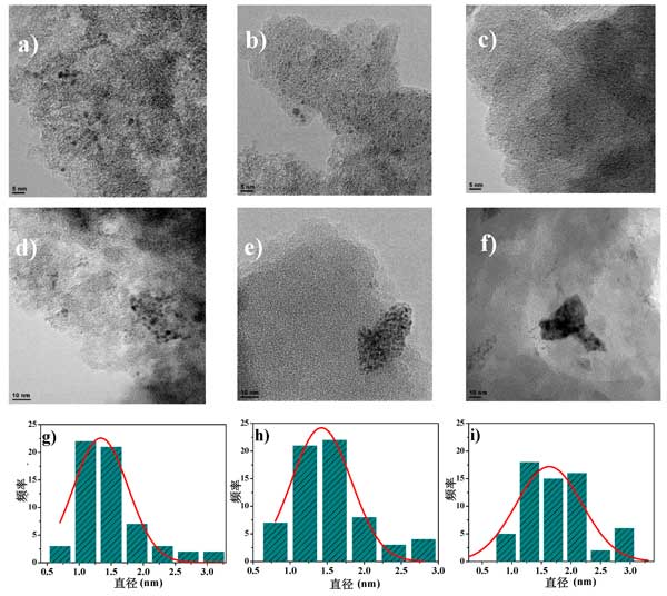 活性炭載釕催化劑獲得的TEM圖像如下。必須提到的是,盡管通常觀察到分散良好的釕納米顆粒(圖1 a–c),但也發(fā)現(xiàn)了一些顆粒團聚(圖1d–f),特別是在使用最氧化的活性炭載體。顆粒大小分布已在圖1g–i中以條形圖繪制,分別為幾種不同活化后的活性炭載體制成的催化劑平均顆粒大小分別為1.3、1.4和1.6 nm。一般而言,TEM數(shù)據(jù)表明,所用的浸漬方法成功地在活性炭材料上形成了小的釕納米顆粒(平均尺寸小于2 nm),并且似乎隨著載體的氧化,其粒徑略有增加。這可以涉及到的釕前體的氧官能團的錨固,和它們的部分分解的還原熱處理期間的效果,這可能導致一些金屬燒結。