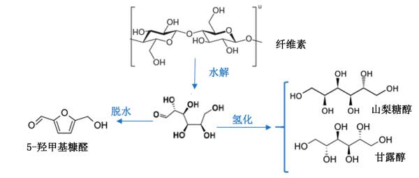 從纖維素中所示產(chǎn)物的反應途徑的簡化方案在圖2展示。在空白試驗(無催化劑)中,纖維素轉化率為35%,并且形成了少量的葡萄糖和羥甲基糠醛。在用活性炭負載的釕催化劑進行的測試中,與空白實驗相比,纖維素轉化率顯著提高,并且山梨糖醇收率很高。這些數(shù)據(jù)中的實驗誤差低于5%。