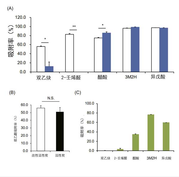 我們測(cè)試了活性炭對(duì)五種散發(fā)惡臭的揮發(fā)性有機(jī)化合物的吸附能力。發(fā)現(xiàn)活性炭對(duì)二乙酰基和2-壬烯醛的吸附水平均高于氧化鋅。但是,與醋酸氧化鋅相比,活性炭的吸附效果略低(圖3A)。相反,活性炭和氧化鋅對(duì)3M2H和異戊酸的吸附能力之間沒有顯著差異。為了比較活性炭和改性活性炭中所含活性炭的吸附能力,使用無法吸附在二氧化鈦上的二乙;鶞y(cè)試了相同量活性炭中的吸附水平。發(fā)現(xiàn)與活性炭相比,改性活性炭的吸附能力沒有顯著變化(圖3B)。