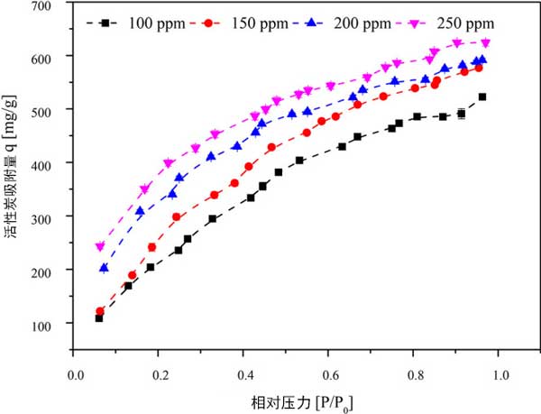 為了確定三氯乙烯初始濃度在進料流中的影響,研究了100、150、200和250ppm的濃度。維持其他實驗條件,活性炭顆粒大小為355μm,床溫為30°C,活性炭重量為50mg。入口濃度為100、150、200和250ppm時的吸附容量分別為523.252、575.844、593.181和624.044mg/g。隨著入口三氯乙烯濃度的增加,在壓力增加的情況下,活性炭的吸附容量顯示出穩(wěn)定的增加。在較高濃度下,隨著壓力的增加,吸附容量的增加可能是由于相鄰分子與微孔中的層內(nèi)分子粘附所致。這導致形成粘附在吸附劑表面上的層內(nèi)分子的相鄰三氯乙烯分子堆疊。三氯乙烯分子的平面形狀的動力學直徑為6.6。因此,它會積聚在活性炭的微孔/中孔上。在活性炭的微孔區(qū)域中具有大孔體積的情況下,假設縫隙形狀的孔幾何形狀,則期望對活性炭上的三氯乙烯具有高親和力。在低濃度(0-8000μg/L)的活性炭上進行了三氯乙烯的吸附,在室溫下吸附量為160mg/g。